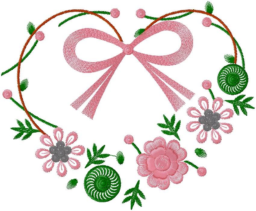 Elegant Floral Heart with Pink Ribbon Embroidery Design