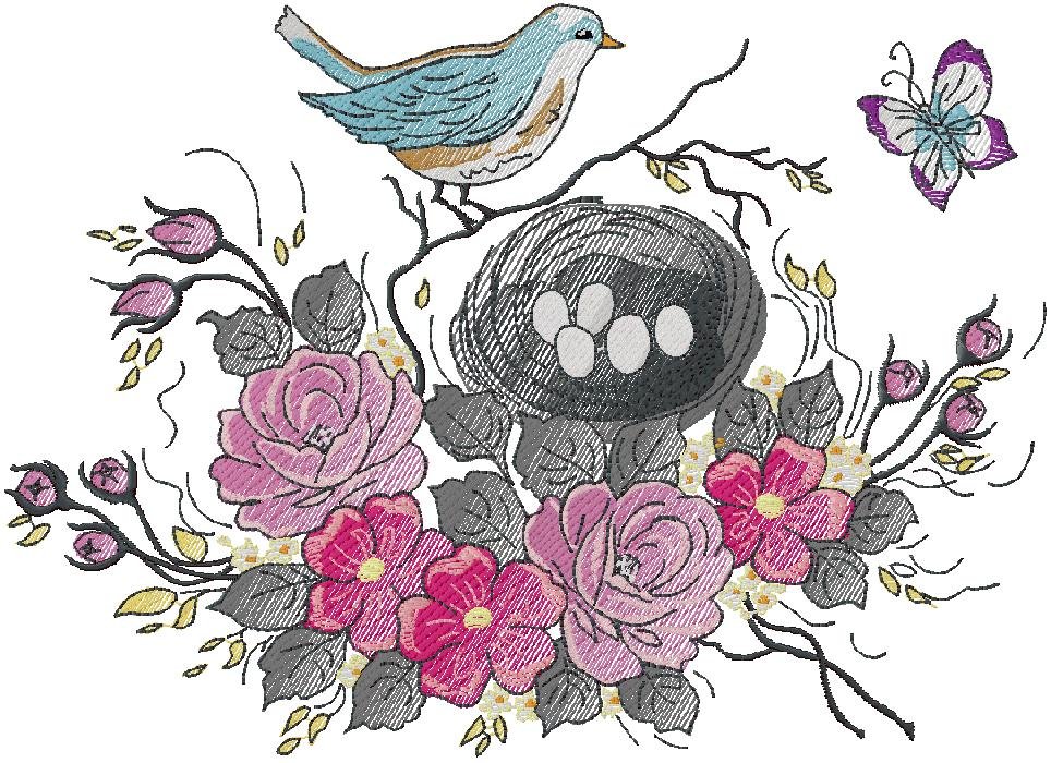 Spring Bird Nest Floral Embroidery Design
